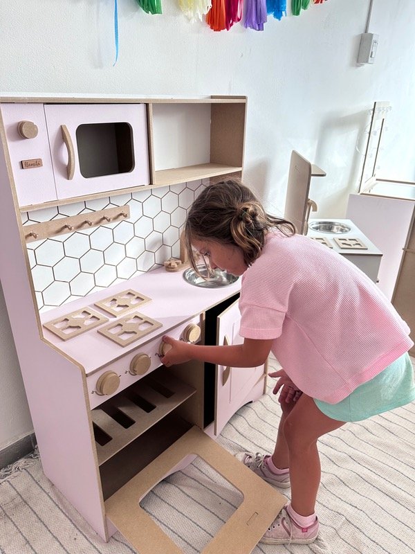 Modelo Matilda XL cuenta con una alacena con microondas, perillas giratorias, utensilios de regalo y tablita.